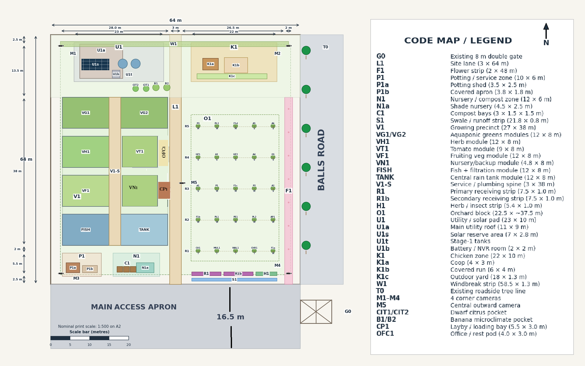 Below is a concept layout for our 1-acre smart farm proof of concept in Raglan Victoria — combining food production, water harvesting, solar, poultry, aquaponics, and remote monitoring. We’re looking to connect with aligned partners in farming, sustainability, agtech, infrastructure.